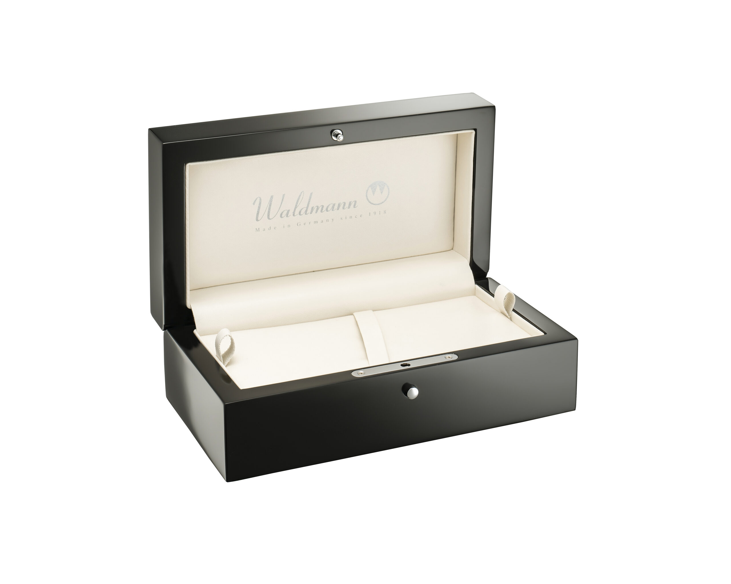Black Wooden Presentation Pen Box. Beautiful luxury Black wooden presentation Pen Box and manufactured to the highest standard of quality. The inside of the box is lined with Ivory leather with a lift out tray for refills or other items. This beautiful classic luxury Black box has a smart Black card outer case for protection. The Black wooden presentation box will hold one or two pens. (pen not included)