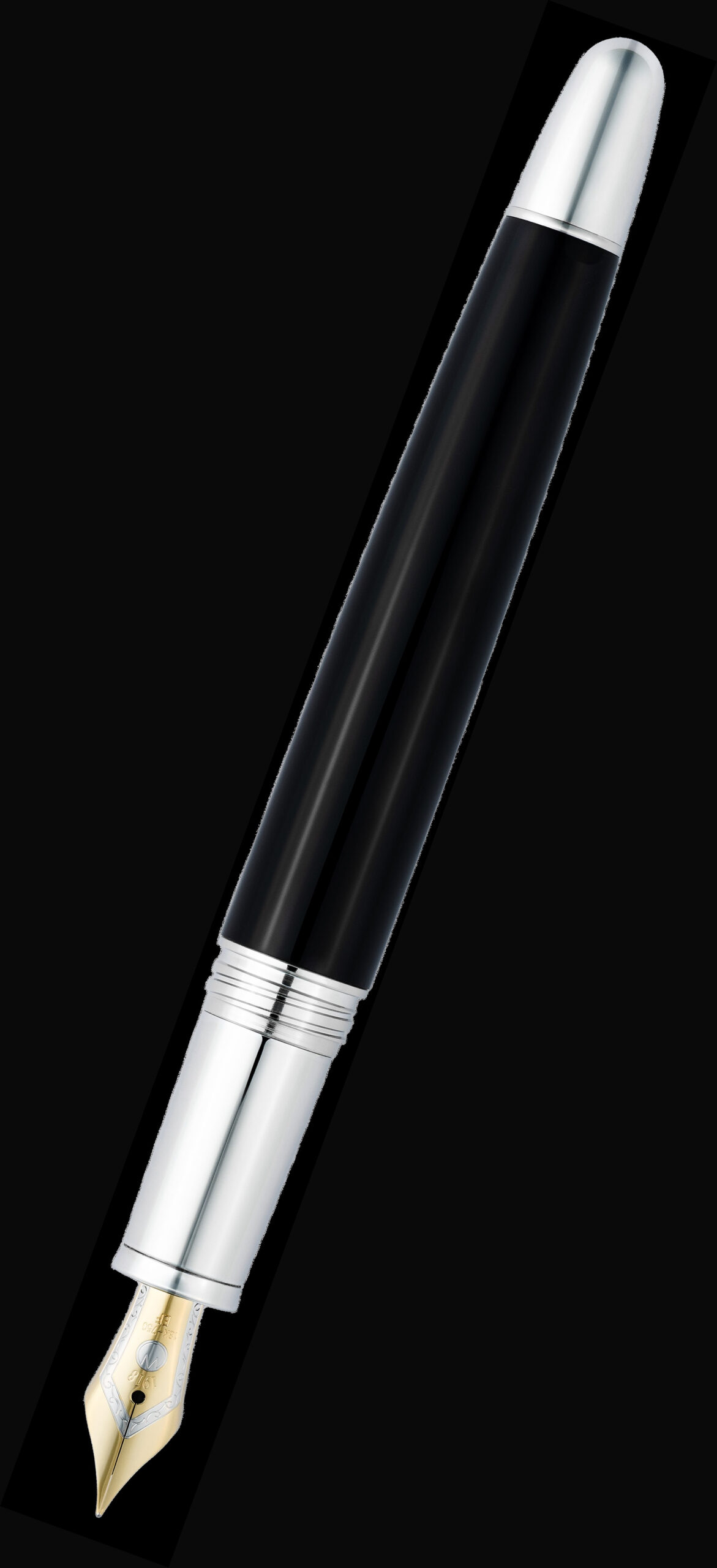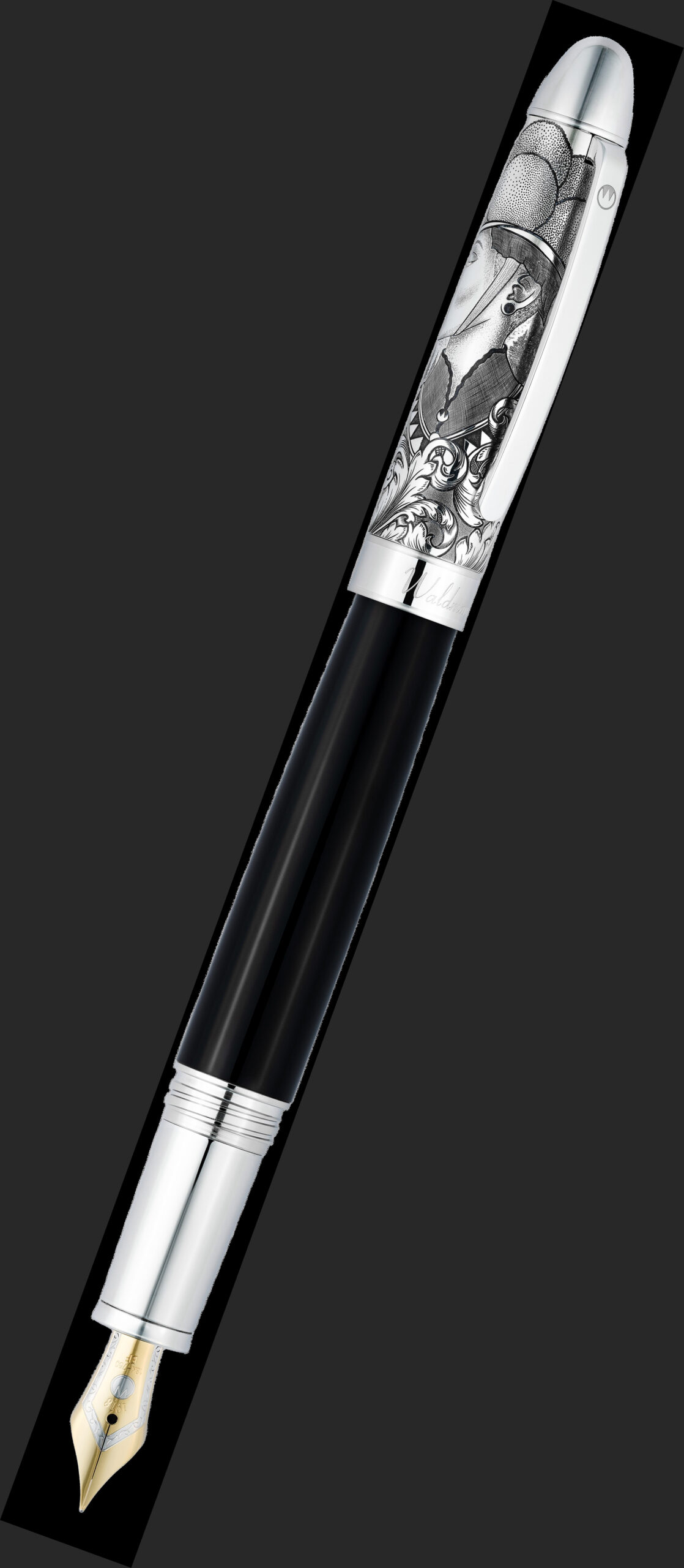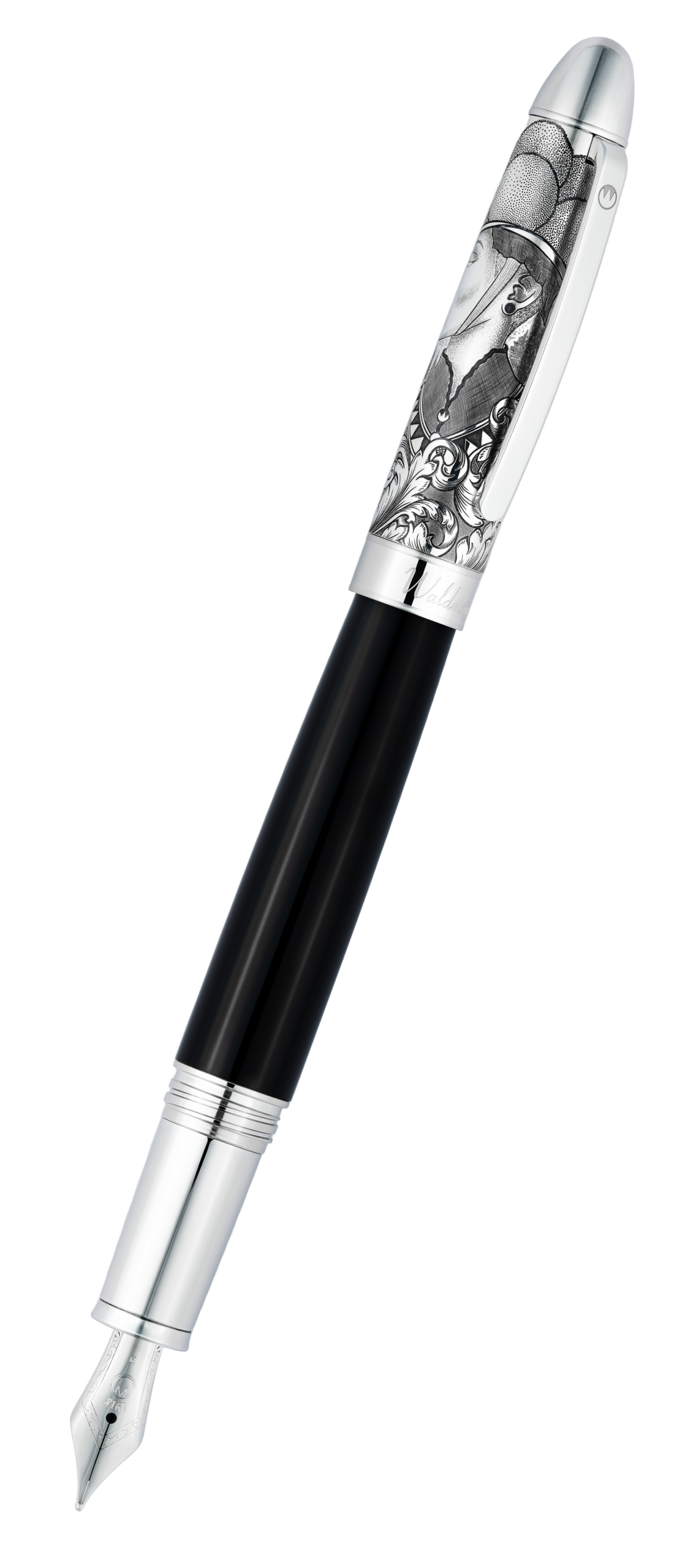 `Legacy One` Fountain Pen Silver Black. The `Legacy One` Silver Fountain Pen is a larger and heavier pen suitable for a person with a larger hand. The stunning hand-engraved cap of the Fountain Pen has a screw-off cap and made from 925 sterling silver. This special hand-engraved silver cap has been designed as a tribute to the Black Forest and each one will be unique. Fine details and depth in the décor speak of nature, heritage and beauty, like the beginning of a legacy. The lower part of the `Legacy One` Fountain Pen has been covered in brilliant black lacquer. Presented in a luxury presentation box including a 10-year guarantee and a silver cleaning cloth. Length: 146mm, length without cap 105mm, diameter 13.1mm and weight 59g. Available with a steel or 18ct gold nib. Please note this is not a stock item and will have to be ordered separately as a special. Please allow 2-4 weeks for delivery. All our silver pens are made by skilled craftsmen at Waldmann Pen. Available with steel or 18ct gold nib