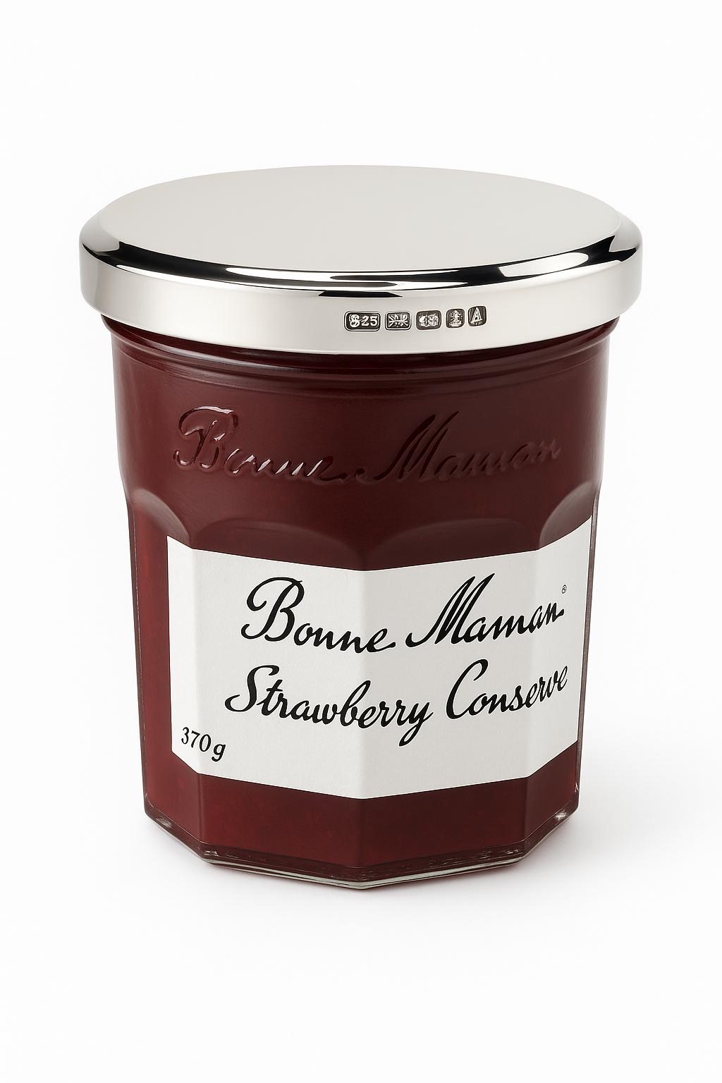 Silver Lid Bonne Maman. Your favourite Bonne Maman jams now with re-usable Sterling Silver 925 lid. The silver jam lid is fully hallmarked on the edge of the silver lid. The lids are interchangeable and fit standard 370g Bonne Maman jam jars. Each Silver jam lid will be sent including a jar. We are able to engrave your sterling Silver Lid with a name, date or short message. Other available Sterling Silver Lids : Marmite – 125 g and 250 g. Branston Pickle Lid – 360 g. Bovril – 125g & 250g. Duchy Cranberry Lid – 340 g. Colmans Mustard Lid – 100 g. Heinz Tomato Ketchup Lid. These Silver Lidded jars are made by our skilled Silversmith in the UK and are all gift boxed. A great gift for the person who has everything!